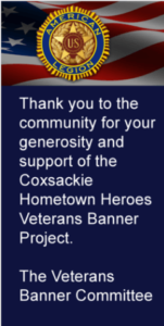 The Military Banner Committee of American Legion Post 166, will be going into Phase 2. This is “The Field of Flags”. The flags will be displayed on the front yard of the old Elm Street School. The cost per flag and plaque will be $25.00. They will be flown from Memorial Day through July 5th. Stop by the Coxsackie Village Office, or click on the link below, to get the flag form. If you have any questions, please call Suellen Meier at (518) 965-6118. (Read More>)